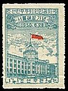The 1w Liberation of Seoul stamp of 1950, showing a red, blue and turquoise flag flying over a building, shown above, is an evocative issue. It is a beautiful stamp that is in high demand.