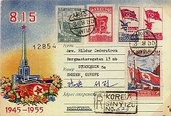 The envelope was sent registered from Sinyizu Sept. 3, 1955, to Stockholm, Sweden. A total of four stamps (from left to right) adorn the cover: a l0w dull green Liberation from Japan stamp, a l0w Soviet Union Friendship Month stamp, a 20w Soviet Union Friendship Month stamp, and a l0w pale red, blue and chestnut Liberation from Japan stamp.