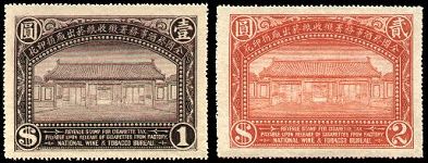 It's based on the 1912 Chinese cigarette tax stamps shown above. There are three stamps in the set, including a 20c green (not shown). Engraved by the Bureau of Printing and Engraving in Peking, and perforated 14, they are listed in Bendig as RT1-3.